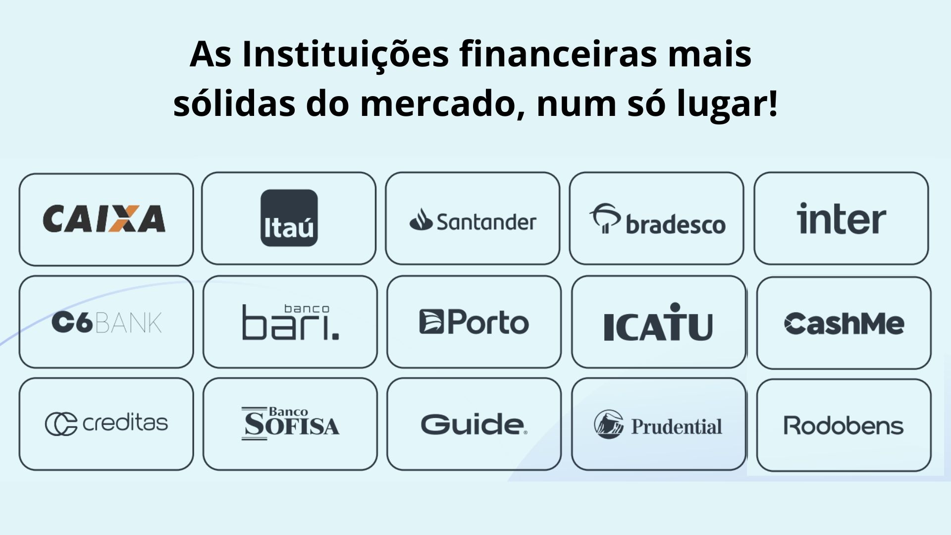 Temos todas as solúções disponíveis no mercado financeiro para financiar o seu novo imóvel. Filtramos a opção que melhor se encaixar no seu projeto. Opções disponíveis: Caixa Econômica, Bradesco, Itaú, Santander, Inter e muito mais.