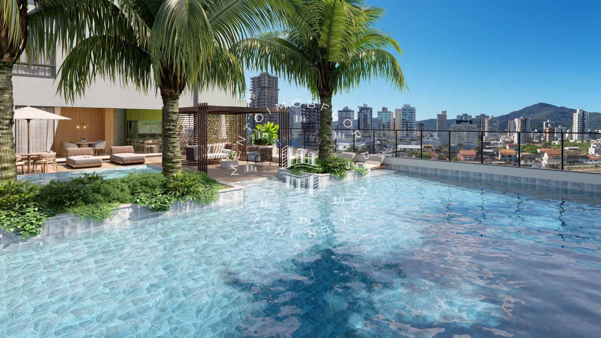 A área de lazer soma aproximadamente 1.577 m², distribuída entre pavimento de lazer e rooftop, oferecendo uma experiência completa de convivência, relaxamento e contemplação. O condomínio conta com piscinas adulto e infantil com prainha, deck, quiosques, quadra poliesportiva, salão de festas, sala de jogos, academia, sauna, playground, espaço kids, pet place, horta e áreas de convivência. No rooftop, o destaque fica para o Sky Garden, Sky Lounge e Wine Lounge, espaços voltados à contemplação, encontros sociais e vistas panorâmicas do litoral.