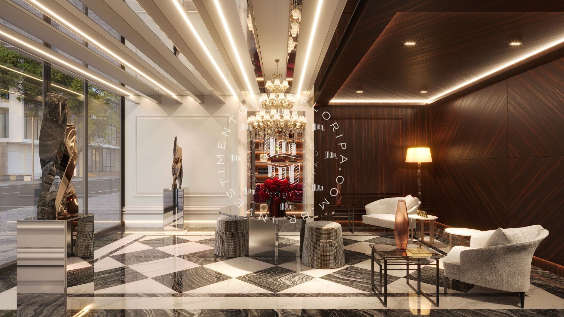 Os interiores refletem o mais alto padrão construtivo: living com grandes vãos e integração total à sacada, persianas automatizadas e acústicas, isolamento entre pavimentos com manta acústica, fechadura eletrônica, infraestrutura completa para automação, climatização, aspiração central, água quente, triturador na cozinha e acabamentos nobres em todos os ambientes. Cada detalhe reforça o conceito de morar com conforto absoluto e sofisticação atemporal.
